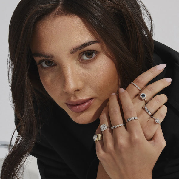 Halo is a setting style where a circle of small diamonds surrounds the center stone, amplifying its brilliance and presence. The halo reflects light back into the center, making the entire ring appear larger, brighter, and more radiant.