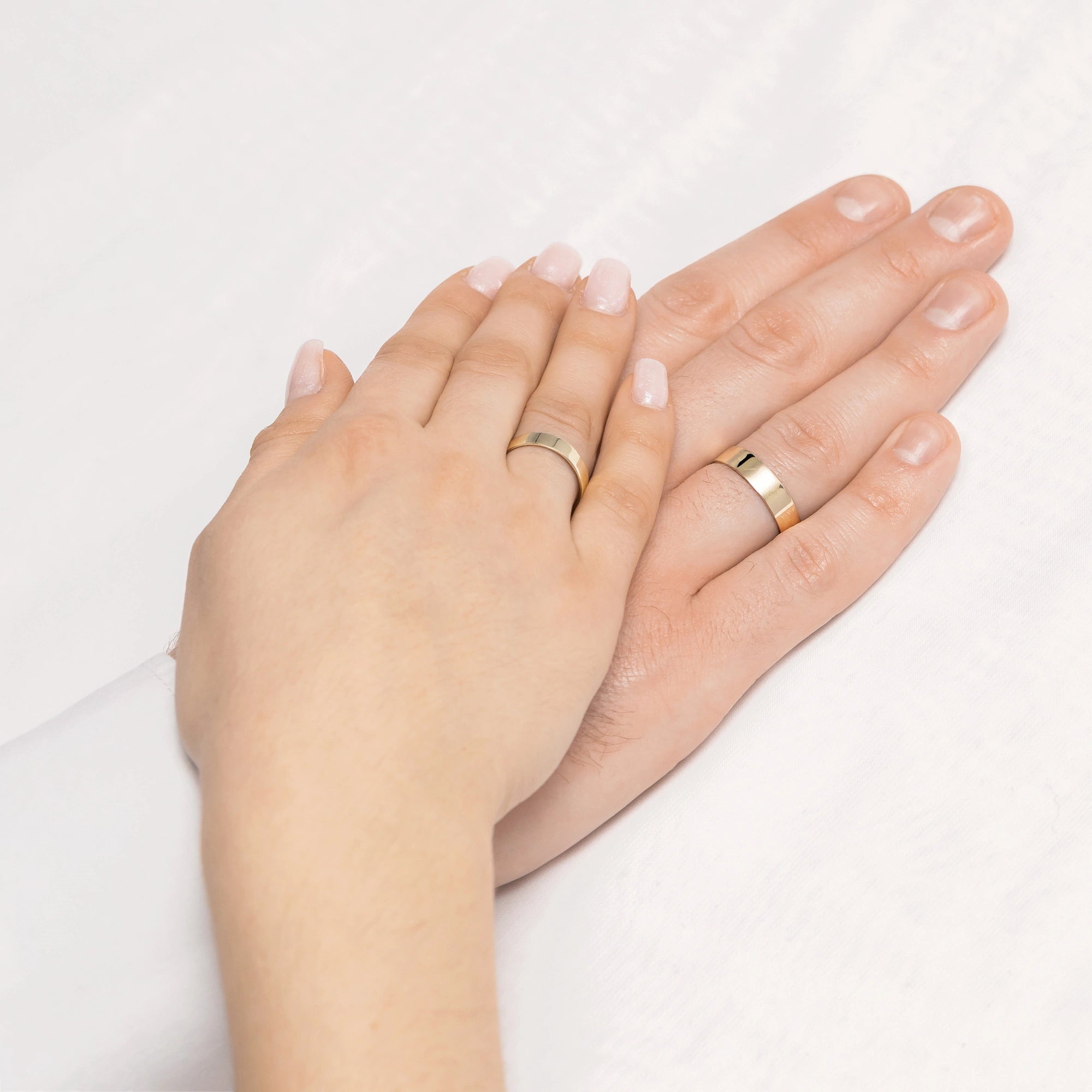 Klasické ploché zlaté obrúčky 4 a 5 mm Ručne vyrobené v šperkovnici Gremari, jedinečné klasické svadobné prstene z 14K (585) zlata sú nadčasovým symbolom večnej lásky. Prsteň, široký 4 a 5 mm a hrubý 1,2 mm, vyzerá na ruke krásne, je nenápadný a dokonale ladí s inými šperkami, ako sú náramky alebo prstene s drahými kameňmi, či zásnubný prsteň. Ponúkame zlaté obrúčky v troch drahých odtieňoch: klasické žlté zlato očarí svojím teplým leskom a je nadčasovým symbolom manželstva; elegantné biele zlato má moderný, chladný, zrkadlový lesk pripomínajúci platinu; zatiaľ čo romantické ružové zlato zaujme svojím jemným, teplým a módnym odtieňom. Každý pár svadobných prsteňov je vyrobený v našej dielni podľa objednávky zákazníka. Je možné ich ďalej personalizovať pridaním rytiny s vlastným textom. Svadobné prstene balíme do elegantnej šperkovnice, ktorá ladí s charakterom vašej ceremónie.