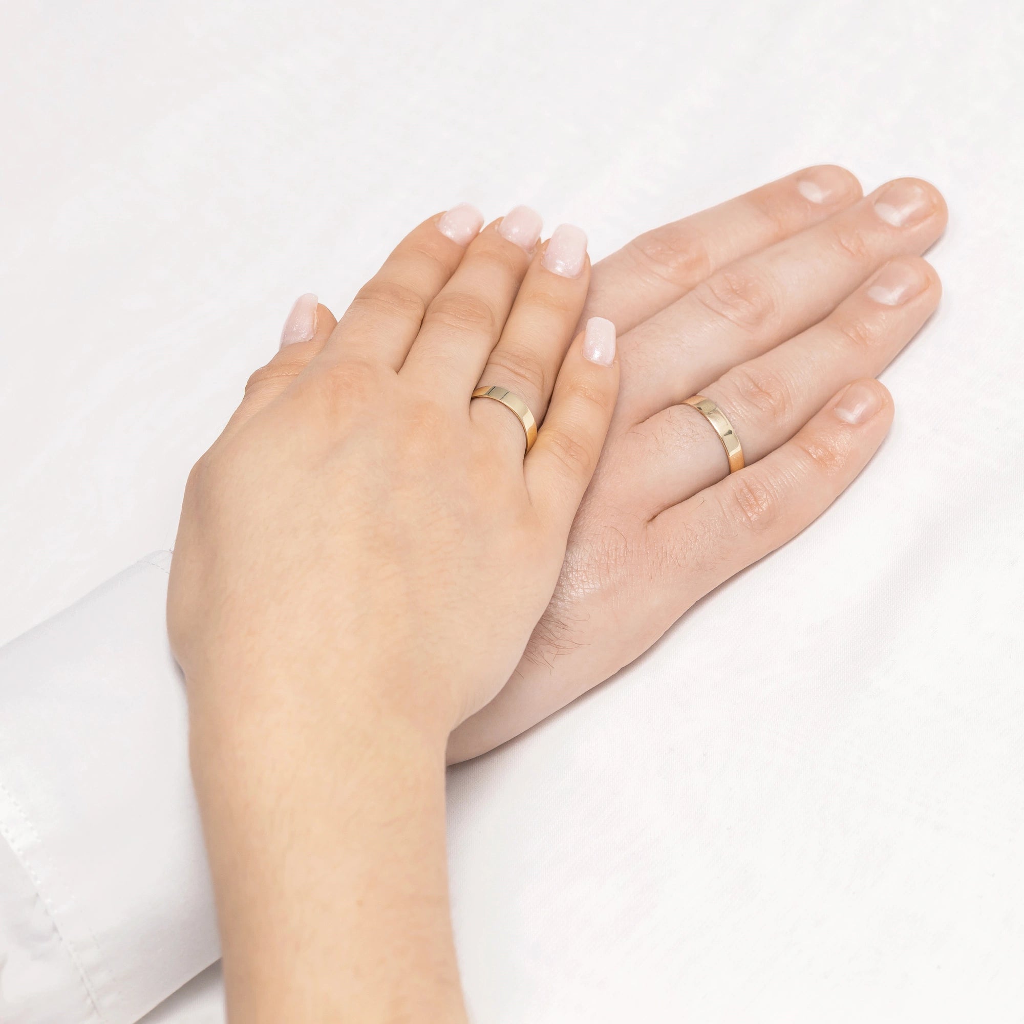 Klasické Ploché zlaté obrúčky 4mm Ručne vyrobené v dielni Gremari, jedinečné klasické svadobné prstene z 14K (585) zlata sú nadčasovým symbolom večnej lásky. Prsteň, široký 4 mm a hrubý 1,2 mm, vyzerá na ruke krásne, je nenápadný a dokonale ladí s inými šperkami, ako sú náramky alebo prstene s drahými kameňmi, či zásnubný prsteň. Ponúkame zlaté obrúčky v troch drahých odtieňoch: klasické žlté zlato poteší svojím teplým leskom a je nadčasovým symbolom manželstva; elegantné biele zlato má moderný, chladný, zrkadlový lesk pripomínajúci platinu; zatiaľ čo romantické ružové zlato očarí svojím jemným, teplým a módnym odtieňom. Každý pár svadobných prsteňov je vyrobený v našej dielni podľa objednávky zákazníka. Je možné ich ďalej personalizovať pridaním rytiny s vlastným textom. Svadobné prstene balíme do elegantnej šperkovnice, ktorá ladí s charakterom vašej obrady.