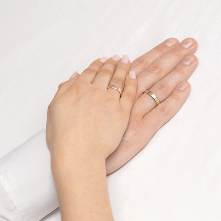 Klasické Plochý Fázovaný zlaté obrúčky na svadobné prstene 4 mm Ručne vyrobené v dielni šperkov Gremari, jedinečné klasické svadobné prstene z 14K (585) zlata sú nadčasovým symbolom večnej lásky. Prsteň, široký 4 mm a hrubý 0,90 mm, vyzerá na ruke krásne, je nenápadný a dokonale ladí s inými šperkami, ako sú náramky alebo prstene s drahokamami, či zásnubný prsteň. Ponúkame zlaté svadobné obrúčky v troch drahých odtieňoch: klasické žlté zlato očarí svojím teplým leskom a je nadčasovým symbolom manželstva; elegantné biele zlato má moderný, chladný, zrkadlový lesk pripomínajúci platinu; zatiaľ čo romantické ružové zlato zaujme svojím jemným, teplým a módnym odtieňom. Každý pár svadobných prsteňov je vyrobený v našej dielni podľa objednávky zákazníka. Je možné ich ďalej personalizovať pridaním rytiny s vlastným textom. Svadobné prstene balíme do elegantnej šperkovnice, ktorá ladí s charakterom vašej ceremónie.