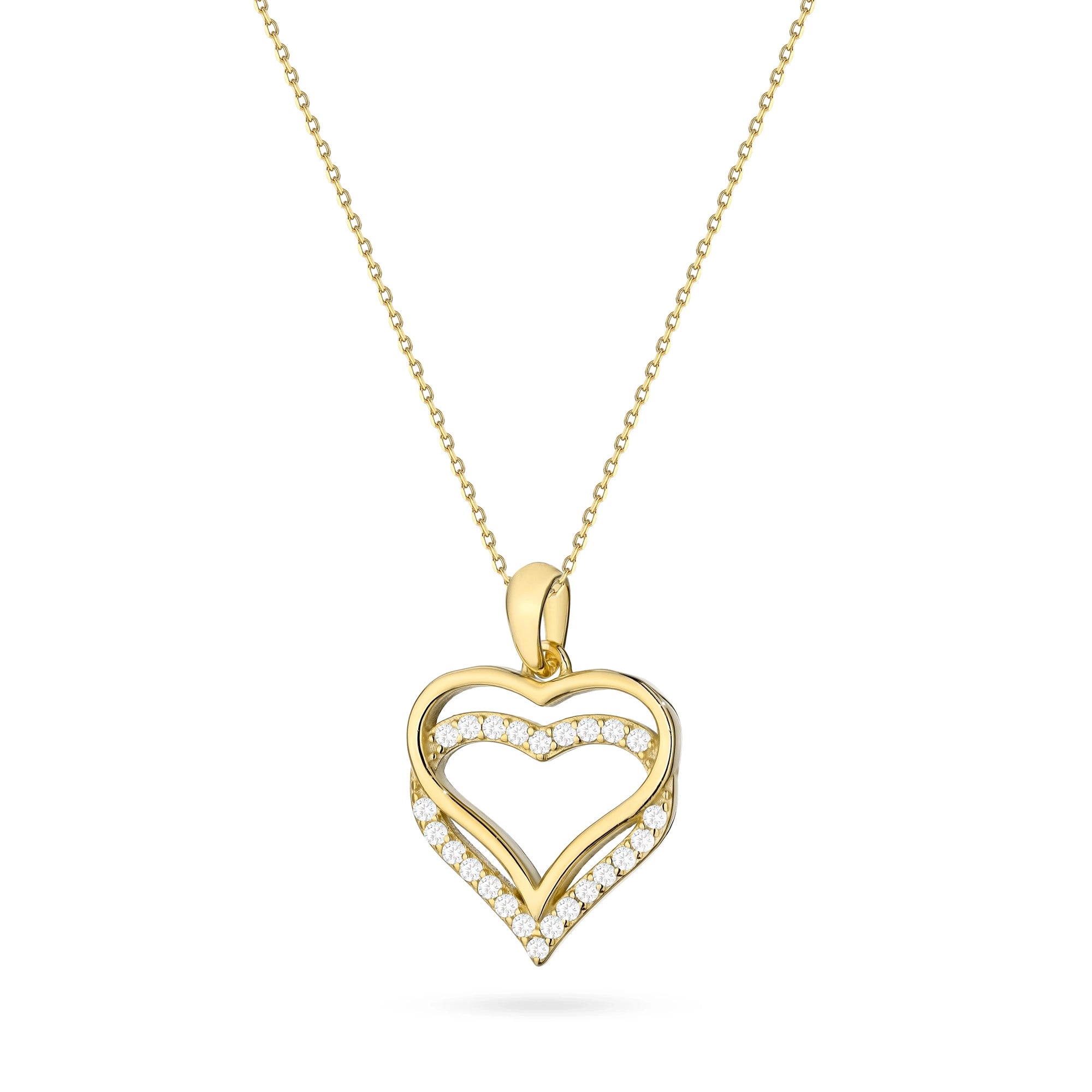 Pozlátený strieborný náhrdelník s prepojenými príveskami v tvare srdca a kubickou zirkóniou