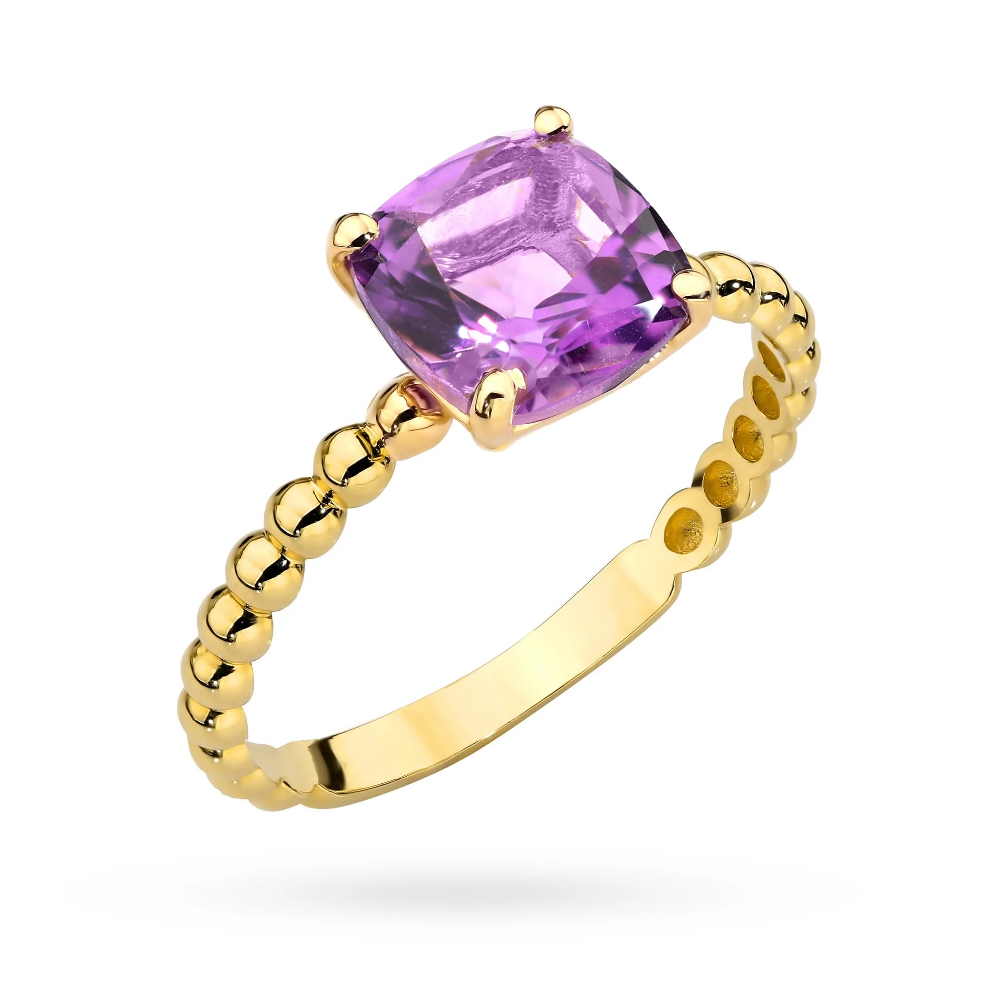 Prsteň zo zlatých korálok so štvorcovým ametystom