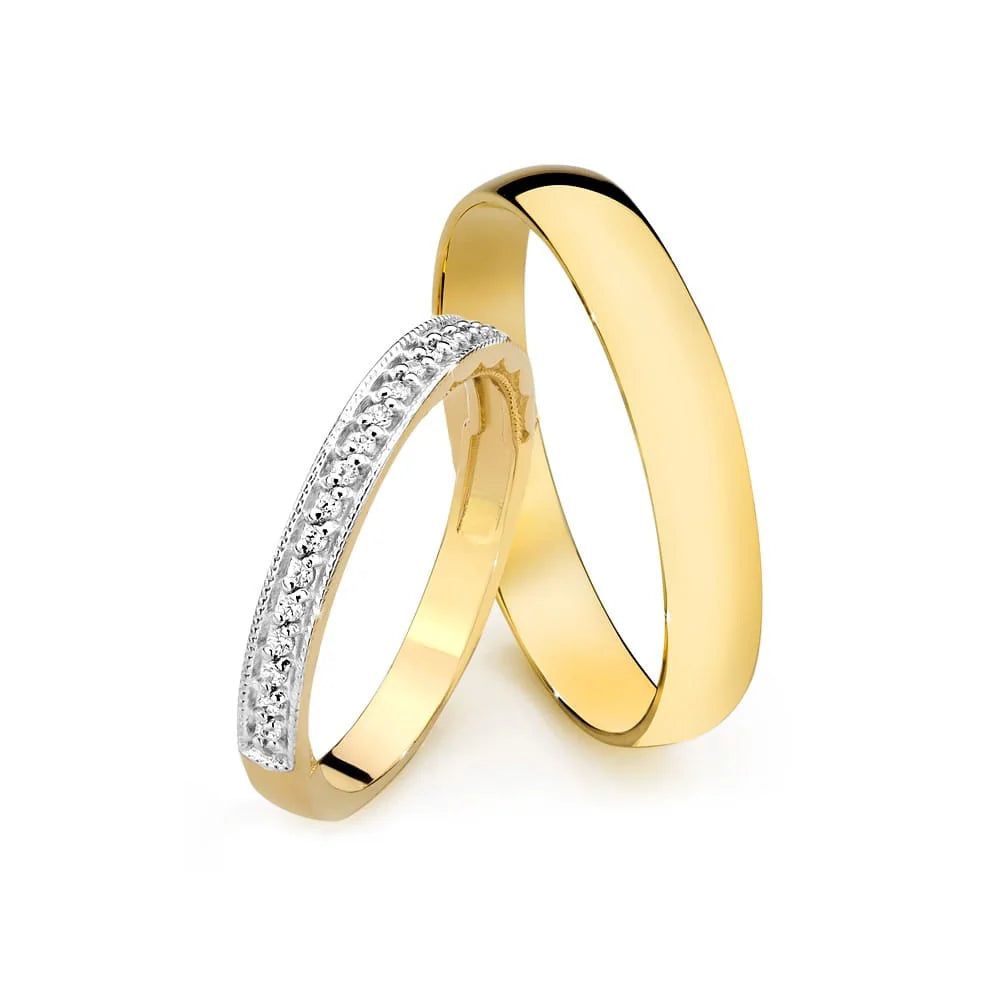 Svadobné obrúčky s diamantmi 0,10 ct, šírka 3 a 4 mm, ručne vyrobené v dielni Gremari, jedinečné klasické svadobné prstene z 14K (585) zlata, sú nadčasovým symbolom večnej lásky. Prsteň, široký 3 a 4 mm, krásne vynikne na ruke, je jemný a dokonale ladí s inými šperkami, ako sú náramky alebo prstene s drahými kameňmi, či zásnubný prsteň. Dámsky prsteň je ozdobený prírodnými diamantmi, kameňmi vytvorenými hlboko v zemi počas miliónov rokov, ktoré symbolizujú večnú lásku, ktorá prekoná všetko. Autenticitu diamantov potvrdzuje certifikát priložený k vášmu nákupu. Každý pár svadobných obrúčok je vyrobený v našej dielni na zákazku. Je možné ich ďalej personalizovať pridaním gravírovania s vlastným textom. Svadobné obrúčky balíme do elegantnej šperkovnice, ktorá ladí s charakterom vašej svadobnej ceremónie.