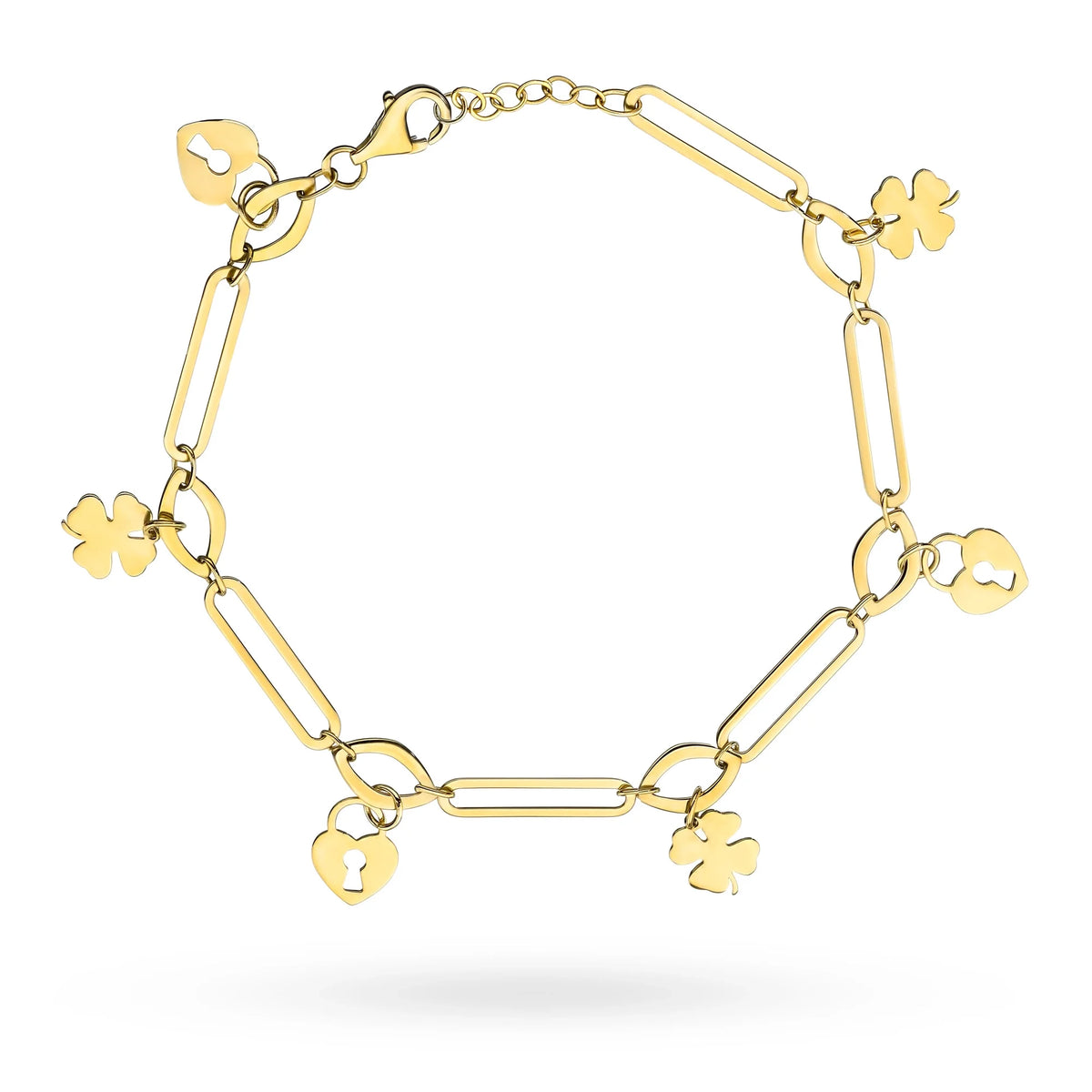 Zlatý náramok so širokými článkami a príveskami zámok a štvorlístok