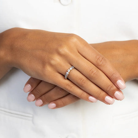 Zlatý prsteň s laboratórne pestovanými diamantmi Ručne vyrobený v tradičnej šperkárskej dielni Gremari, tento 14K zlatý prsteň s 0,10 ct laboratórnym diamantom a 6 laboratórne pestovanými diamantmi s celkovou hmotnosťou 0,03 ct stelesňuje nadčasovú krásu a majstrovské remeslo. Osadený v 14K zlate s puncom 585, drahokamy spájajú eleganciu, jemnosť a odolnosť. Prsteň je dostupný v troch farebných variantoch: žlté zlato, biele zlato a ružové zlato – jednoducho si vyberte preferovanú variantu vyššie.