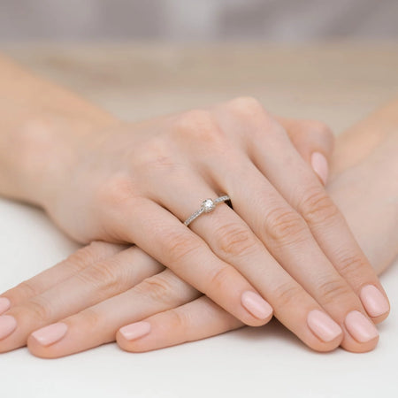 Ručne vyrobený v tradičnej zlatníckej dielni Gremari, tento 14K zlatý prsteň s 0,10 ct laboratórnym diamantom a 10 laboratórne pestovanými diamantmi s celkovou hmotnosťou 0,05 ct predstavuje nadčasovú krásu a majstrovské remeslo.