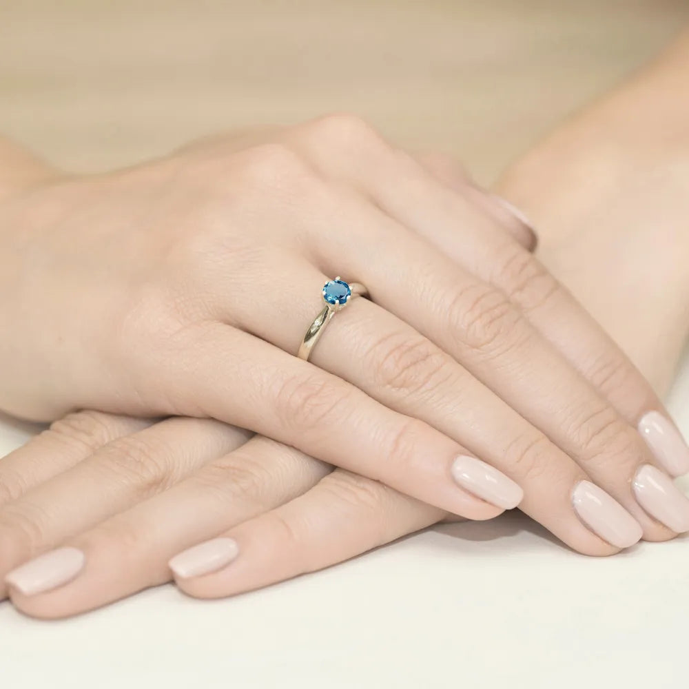 Zlatý prsteň s 0,50ct topásom London Blue a 0,01ct diamantmi Ručne vyrobený v tradičnej zlatníckej dielni Gremari, tento zlatý prsteň s 0,50ct topásom London Blue a doplnkovými postrannými diamantmi s celkovou hmotnosťou 0,01ct stelesňuje nadčasovú krásu a remeselnú zručnosť. Osadený v 14K zlate s puncom 585, tento drahokam kombinuje eleganciu, jemnosť a odolnosť. Tento prsteň je ideálnou voľbou na zásnuby, symbolizujúc lásku, oddanosť a večné puto. Je tiež skvelým a elegantným darčekom k výročiam, narodeninám, Vianociam a iným významným príležitostiam.